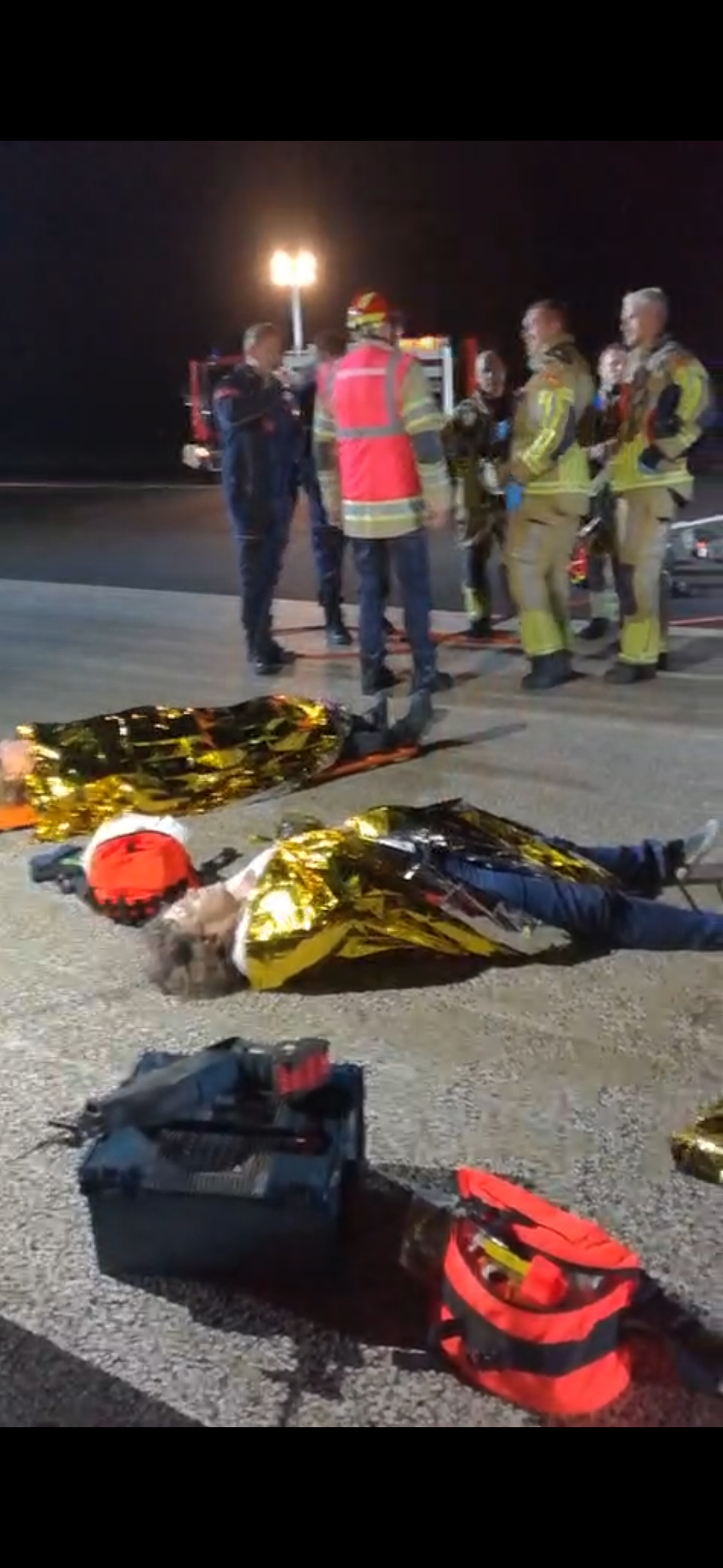 Het was die avond bitter koud, ik had geen warme kleding aan, want ik zat in een warm vliegtuig, met de bagage boven mijn hoofd, dus het rillen gebeurde spontaan, daar hoefde ik niet voor te acteren. Diverse controles werden uitgevoerd, al is het nog niet makkelijk om aan te geven dat je long het niet zo goed meer doet. Ook de grime was in het kunstlicht wat moeilijk te zien. Na een lange lig op de koude grond, waarbij ik een “sedatie” had gehad, werd ik dan eindelijk met een ambulance vervoerd naar de hangar, waarna de oefening vrij snel was afgelopen.